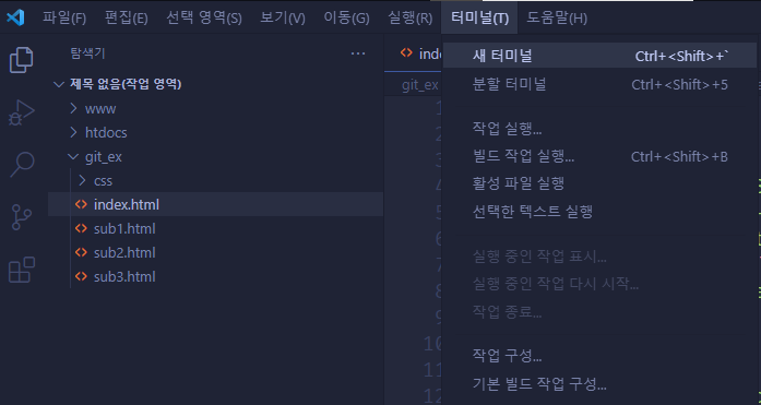 5. git_ex폴더를 작업영역폴더로 추가한 후, 터미널>새터미널을 연다.