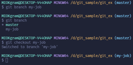 위 명령어의 의미는 "브랜치명"라는 이름의 가지를 만들고 갈아탄다는 것을 의미합니다.. 즉, 새 브랜치로 이동하는 것입니다.