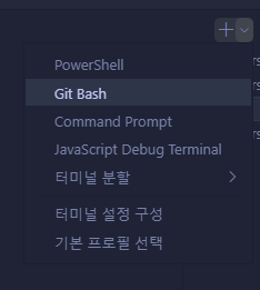 6. 터미널 창 우측에 +버튼을 클릭 해 Git Bash를 선택한다.