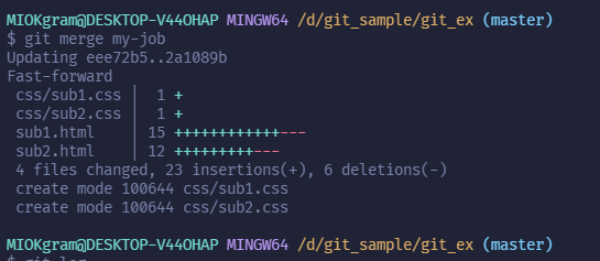 | $ git merge my-job | master branch 에서 my-job branch 의 내용을 가져와 병합한다 |