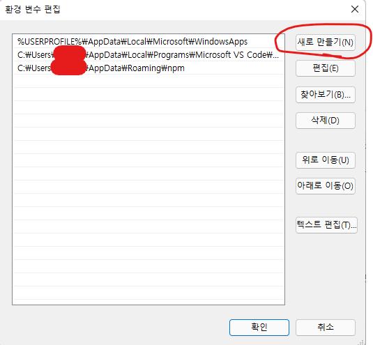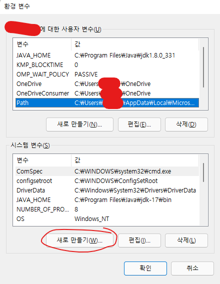 내PC [우클릭] > 속성 > 고급 시스템 설정 > 환경변수 > OOO에 대한 사용자변수 > 새로만들기