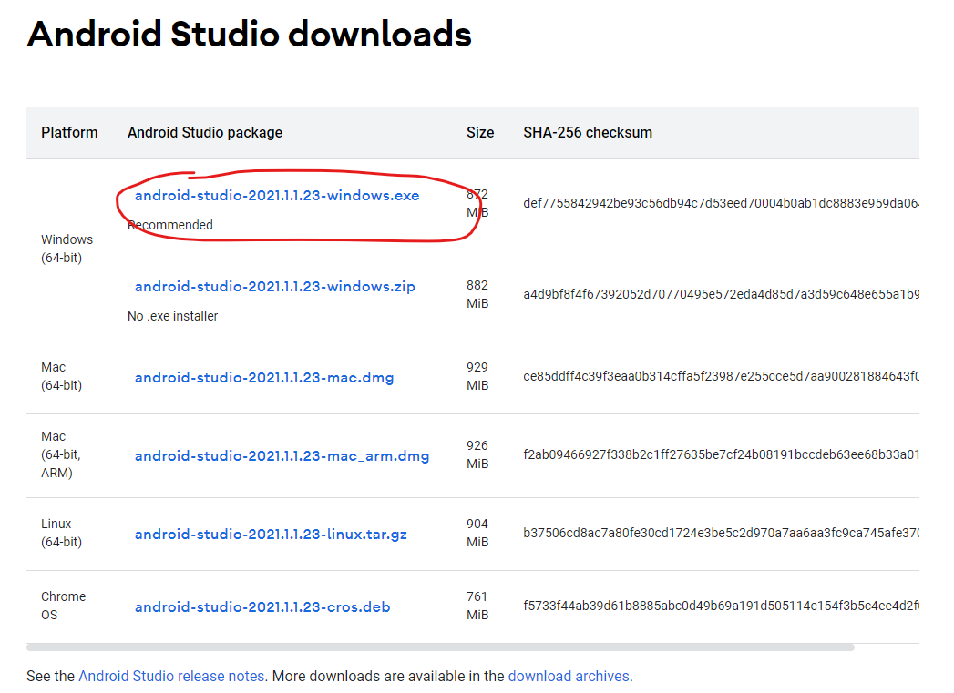 WIndows(64-bit) android-studio-2021.1.1.23-windows.exe 다운받기