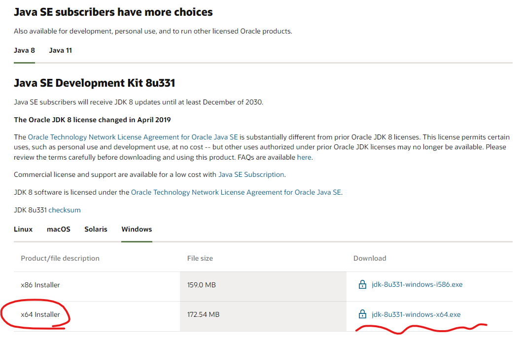 jdk-8u331-windows-x64.exe 를 받는다.