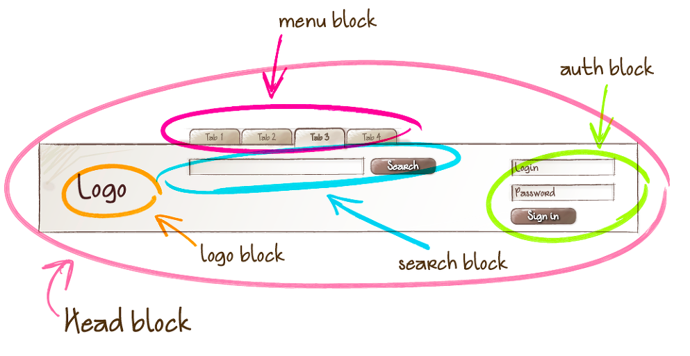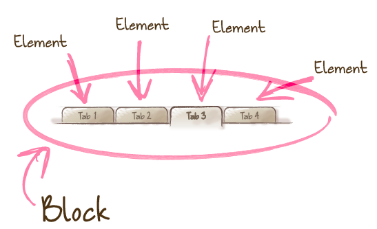 BEM의 재미있는 점은, .block_element2 를 .block_element1 의 하위 엘리먼트로 보지 않고 둘 다 똑같이 .block 의 엘리먼트로 취급한다.