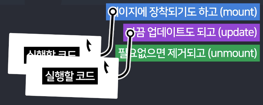 이렇게 컴포넌트 라이프 사이클에 맞춰 코드를 실행해달라고 간섭할 수 있는데, 간섭은 갈고리를 달아서 한다.