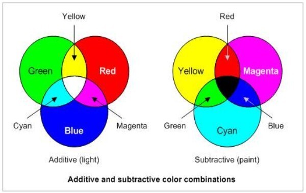 R는 적색, G는 녹색, B는 청색, R + G = 황색, R + B = 붉은 보라색(마젠타), B + G = 청록색(시안), R + G + B = 백색, R·G·B의 어느 것도 가해지지 않으면, 즉 어느 것도 비춰지지 않으면 흑색이 된다.