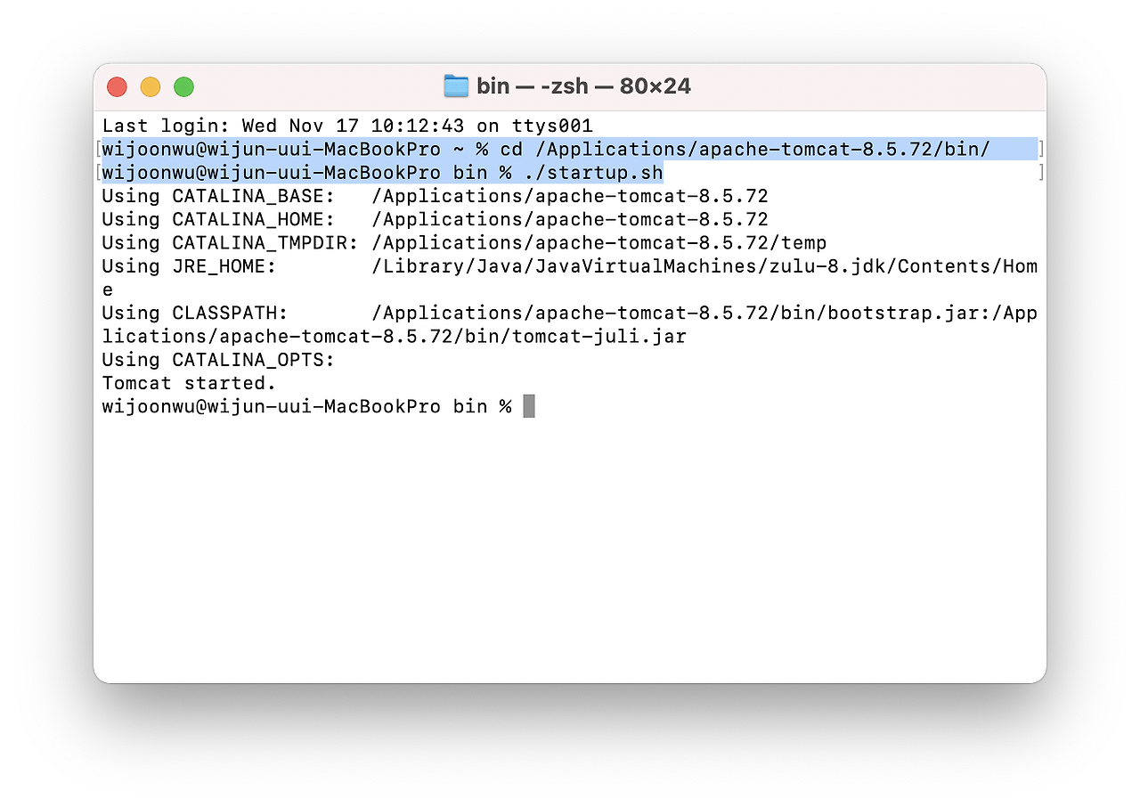 - `./startup.sh` 명령어를 입력하여 톰캣을 실행합니다.