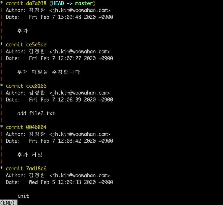 보통 커밋해쉬를 다 보진 않는다. 해쉬값 전체를 사용하는 경우도 없었고 말이다. 커밋 해쉬값을 앞에 7자리만 간단히 보여주는 것이 좋겟다. `--abbrev-commit` 옵션을 추가해보자.