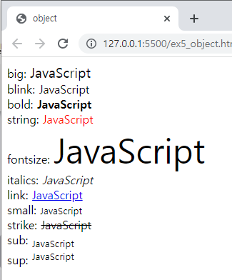 output += 'big: ' + string.big() + '<br/>'; // 글자 크기를 키워줌