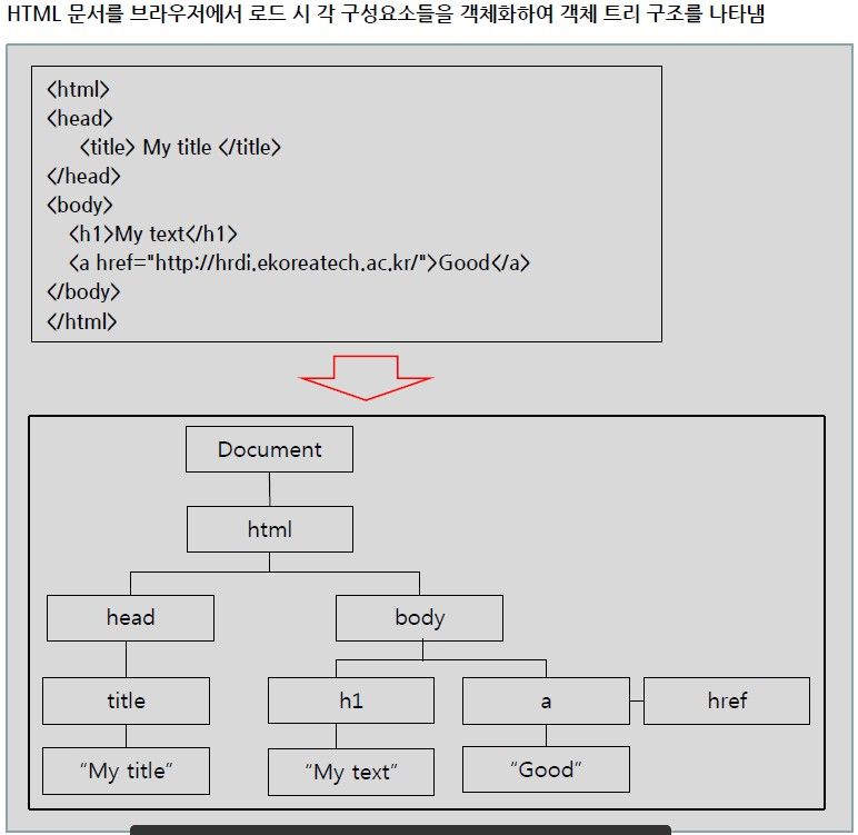 * HTML 문서를 브라우저에서 로드 시 각 구성요소들을 객체화하여 객체 드리 구조를 나타냄